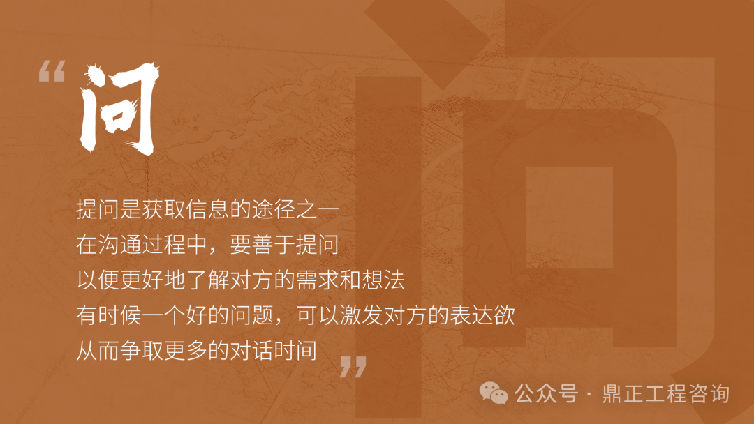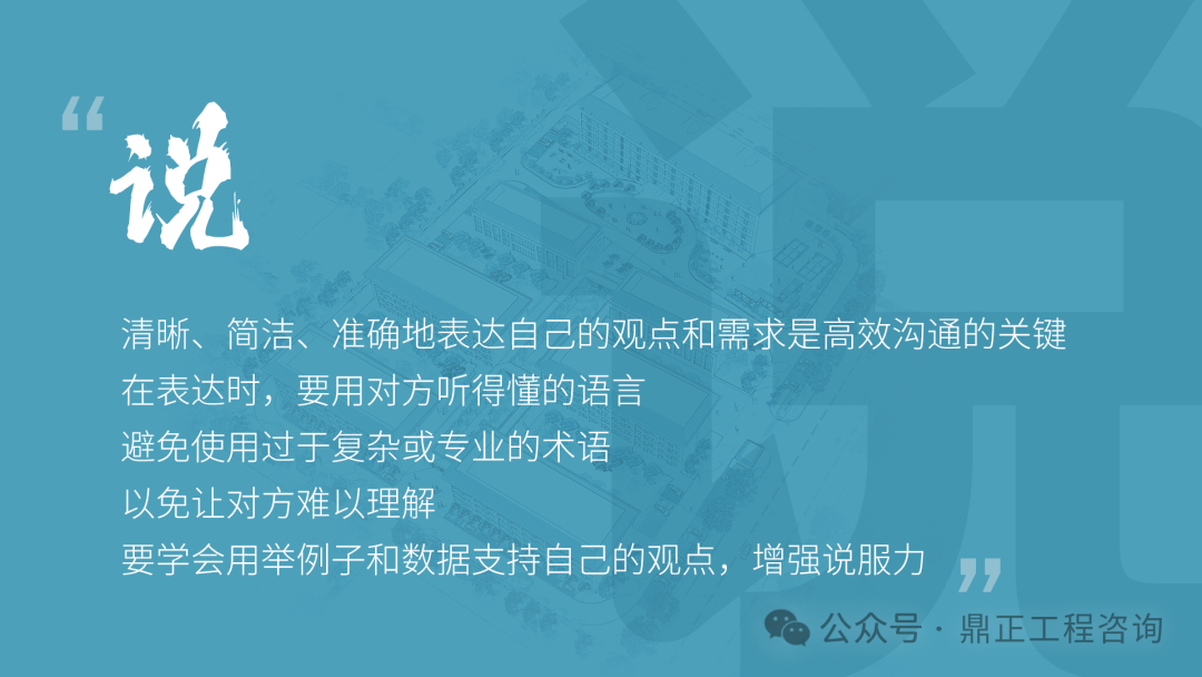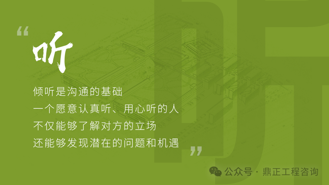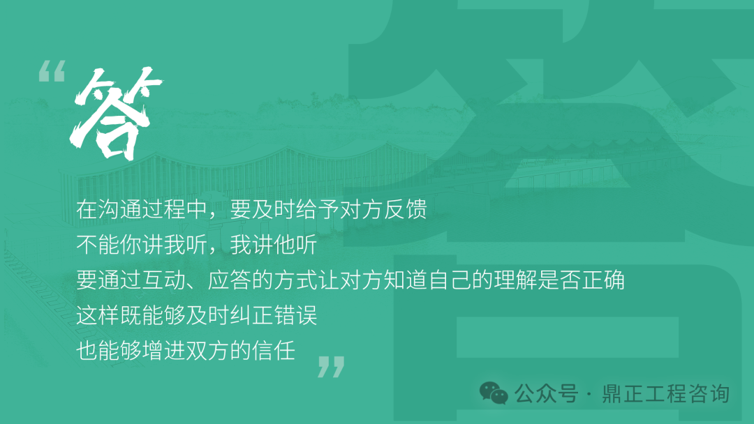 交流要看對(duì)象,不能對(duì)牛彈琴。與農(nóng)民工交流要用農(nóng)民工聽(tīng)得懂的語(yǔ)言;與同行或其他咨詢機(jī)構(gòu)交流要用專業(yè)語(yǔ)言;與直接上級(jí)交流要及時(shí)反饋并提出合理建議;與客戶交流,要從客戶的視角出發(fā),為其提供最優(yōu)解決方案。
