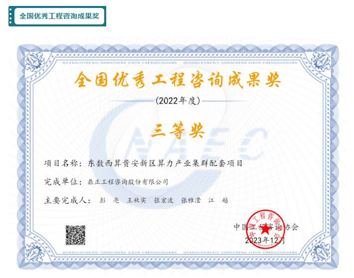 東數(shù)西算貴安新區(qū)算力產業(yè)集群配套項目榮獲全國優(yōu)秀工程咨詢成果獎三等獎。