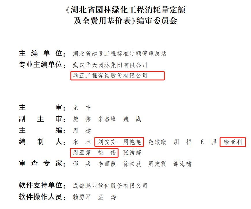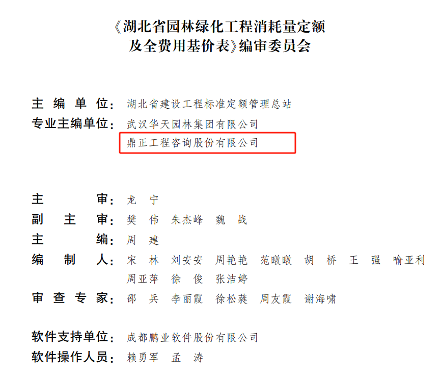 鼎正作為《湖北省園林綠化工程消耗量定額及全費用基價表》《湖北省建筑安裝工程費用定額》的參編單位之一,充分發(fā)揮全過程工程咨詢資源集中的優(yōu)勢,為此次定額的修訂貢獻了鼎正在全過程工程咨詢、工程造價咨詢業(yè)務(wù)領(lǐng)域編審設(shè)計概算、投資估算、工程預(yù)算、過程結(jié)算、竣工結(jié)算等實踐經(jīng)驗,對進一步完善工程造價計價依據(jù)體系提供了有力的技術(shù)支撐。