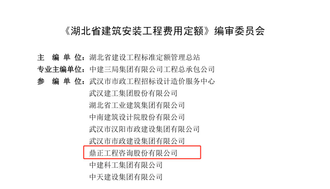 鼎正高度重視標準化工作,多次參與國家、地方及行業(yè)標準編制。此次參與《湖北省建筑安裝工程費用定額》《湖北省建筑安裝工程費用定額》的定額編制,既是鼎正多年堅持多年各咨詢板塊專業(yè)化沉淀和發(fā)展的集中體現(xiàn),更是鼎正履行推動行業(yè)進步、規(guī)范建設(shè)市場行為的專業(yè)職責所在。下一步,鼎正將繼續(xù)發(fā)揮專業(yè)優(yōu)勢,集結(jié)公司更多骨干專家力量,為提升行業(yè)整體標準化水平、促進行業(yè)的高質(zhì)量發(fā)展貢獻專業(yè)力量。