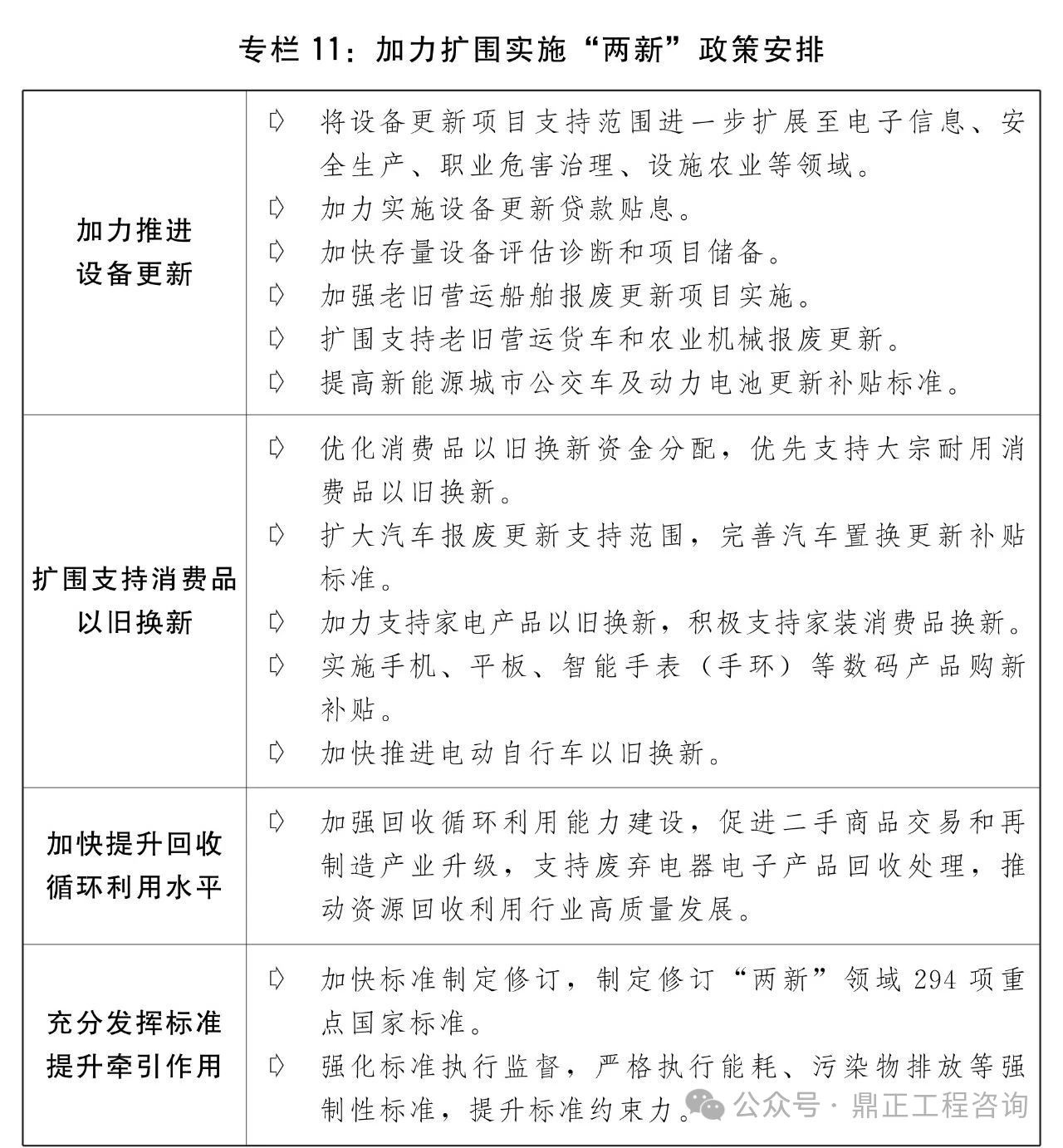 安排超長(zhǎng)期特別國(guó)債5000億元支持大規(guī)模設(shè)備更新和消費(fèi)品以舊換新,統(tǒng)籌投資、財(cái)政、金融等綜合性政策,深入推進(jìn)設(shè)備更新、消費(fèi)品以舊換新、回收循環(huán)利用、標(biāo)準(zhǔn)提升四大行動(dòng)。進(jìn)一步加大重點(diǎn)領(lǐng)域設(shè)備更新項(xiàng)目支持力度,加力實(shí)施設(shè)備更新貸款貼息,加快存量設(shè)備評(píng)估診斷和項(xiàng)目?jī)?chǔ)備。進(jìn)一步支持消費(fèi)品以舊換新,擴(kuò)大汽車(chē)報(bào)廢更新支持范圍,完善汽車(chē)置換更新補(bǔ)貼標(biāo)準(zhǔn),實(shí)施手機(jī)、平板等數(shù)碼產(chǎn)品購(gòu)新補(bǔ)貼,積極支持家裝消費(fèi)品換新,簡(jiǎn)化補(bǔ)貼申領(lǐng)和支付流程,完善資金監(jiān)管機(jī)制,嚴(yán)厲打擊價(jià)格欺詐和違規(guī)騙補(bǔ)套補(bǔ)行為。